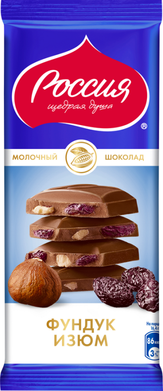Шоколад молочный РОССИЯ ЩЕДРАЯ ДУША с фундуком и изюмом, 82г