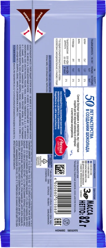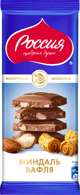 Шоколад молочный РОССИЯ ЩЕДРАЯ ДУША с миндалем и вафлей – это нежный вкус шоколада, с добавлением настоящего молока, отборного миндаля и хрустящей вафли. Признанный шедевр, созданный из лучших ингредиентов!