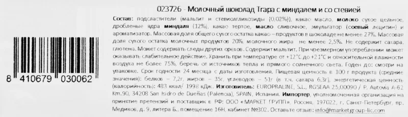 Подсластители (мальтит, стевиогликозиды (0,02%)), какао масло, молоко сухое цельное, дробленые ядра миндаля (12%), какао тертое,масло сливочное, эмульгатор – соевый лецитин, ароматизатор.