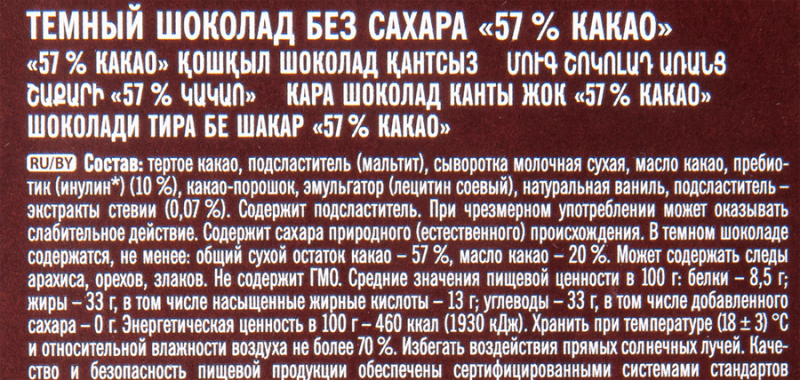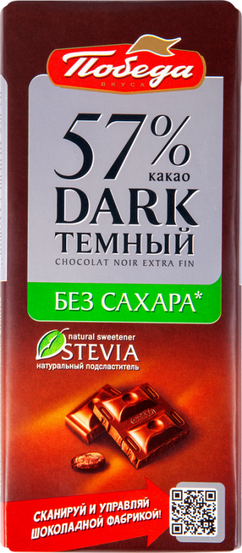 Шоколад темный ПОБЕДА ВКУСА без сахара 57% какао просто идеален для полноценной и здоровой жизни. В этой эксклюзивной серии некалорийного темного шоколада без сахара с «медовой травой» стевией на 12% меньше калорий, чем обычно, и всего 0% сахара!