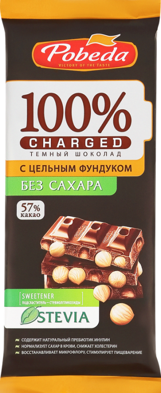 Шоколад темный ПОБЕДА ВКУСА Charged с цельным фундуком, без сахара обладает хорошо сбалансированным приятным вкусом. Вместо сахара в нем используется натуральный заменитель – стевия. Шоколад помогает быстро пополнить запасы энергии и приносит пользу организму. Он активизирует работу мозга, повышает выносливость, поднимает настроение.