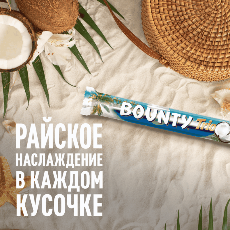 Шоколадный батончик BOUNTY Trio – это нежнейшая мякоть кокоса, покрытая толстым слоем молочного шоколада, приготовленного из отборных ингредиентов. Аромат БАУНТИ дарит райское удовольствие, буквально переносит на тропический остров, помогая забыть все заботы и тревоги. Вкусный десерт, тающий во рту, идеально дополнит чашечку горячего чая или кофе.