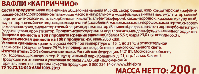 Мука пшеничная общего назначения М55-23, сахар белый, жир кондитерский (рафинированное дезодорированное растительное масло внатуральном и модифицированном виде (пальмовое), эмульгатор соевый лецитин, антиокислитель концентрат смеси токоферолов),какао-порошок, крахмал кукурузный, эмульгатор соевый лецитин, соль, шоколад темный (сахар белый, какао тертое, масло какао,эмульгатор соевый лецитин, эмульгатор Е476, ароматизатор Ванилин), разрыхлитель – гидрокарбонат натрия (сода пищевая),ароматизатор. Продукт может содержать следы арахиса, миндаля, фундука, молочных продуктов.