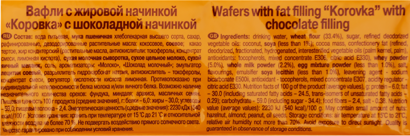 Вафли РОТ ФРОНТ Коровка с шоколадной начинкой – сладко-пряное лакомство от фабрики Рот Фронт. Нежный хруст воздушных вафель и тающая текстура шоколадной начинки создают насыщенный яркий вкус с характерными молочно-сливочными нотками и пряными оттенками какао.