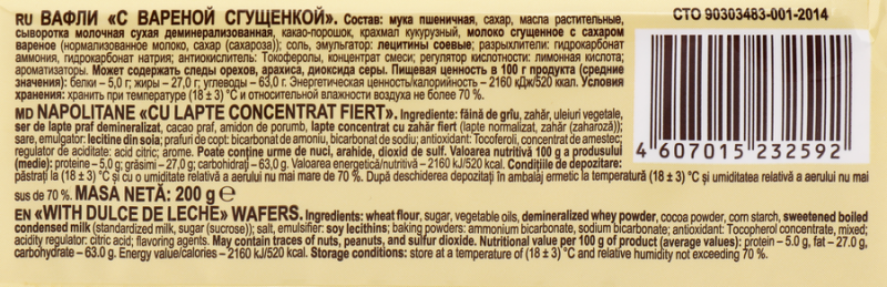Вафли ЯШКИНО с вареной сгущенкой представляют собой семь вафельных слоев с начинкой из вареной сгущенки между ними. Для производства используются только натуральные ингредиенты высшего качества.