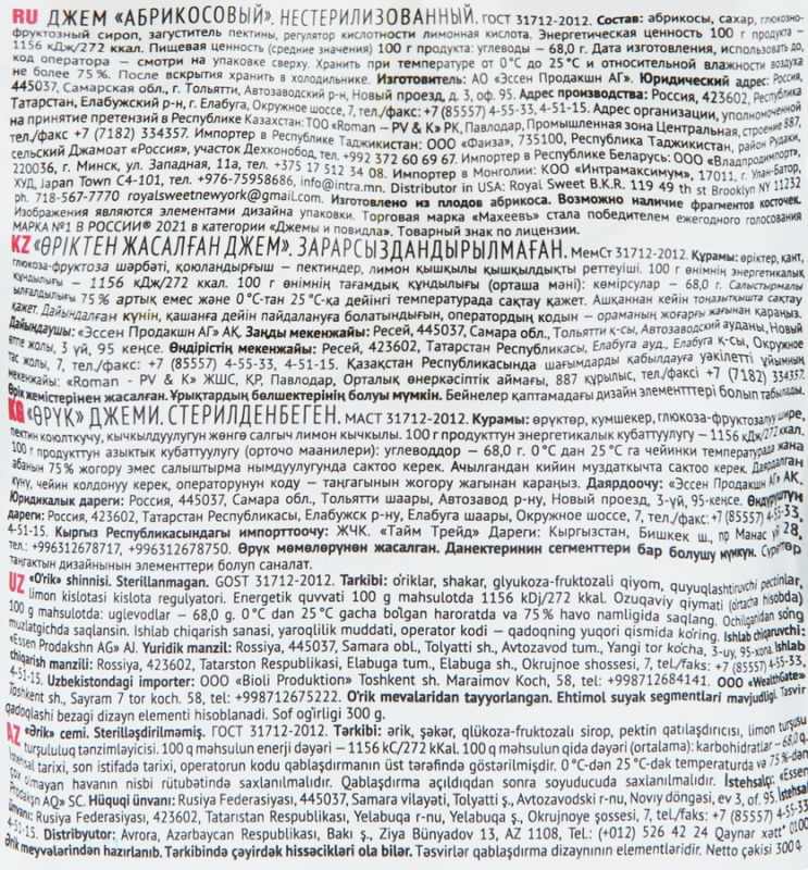 Джем МАХЕЕВЪ Абрикосовый приготовлен на основе натуральных абрикосов. В составе этого плода есть множество полезных веществ, которые остаются и в продуктах, производимых из него: лимонная, яблочная, фенольные и дубильные вещества. Джем МАХЕЕВЪ Абрикосовый прекрасно сочетается с тостами, с блинчиками и с кашей, способен сделать восхитительно вкусным даже диетический йогурт или творог. Используют в выпечке как начинку или украшение.