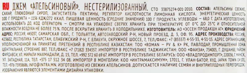 Апельсины свежие, сахар, глюкозный сироп, загуститель – фруктовый пектин, регулятор кислотности – лимонная кислота.