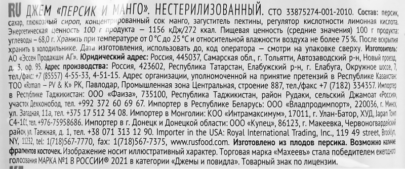 Персик, сахар, глюкозный сироп, концентрированный сок манго, загуститель – пектины, регулятор кислотности – лимонная кислота.