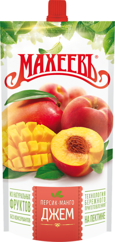 Джем МАХЕЕВЪ Персик и манго — пикантный джем с экзотическим вкусом. Джем обладает высокой питательной ценностью и превосходными вкусовыми качествами. В нем сохранены витамины, содержащиеся в ягодах и фруктах. Подходит для намазывания на тост, блинчики, добавления в творог и у другим блюдам. Может быть основой для десерта, использоваться в выпечке.