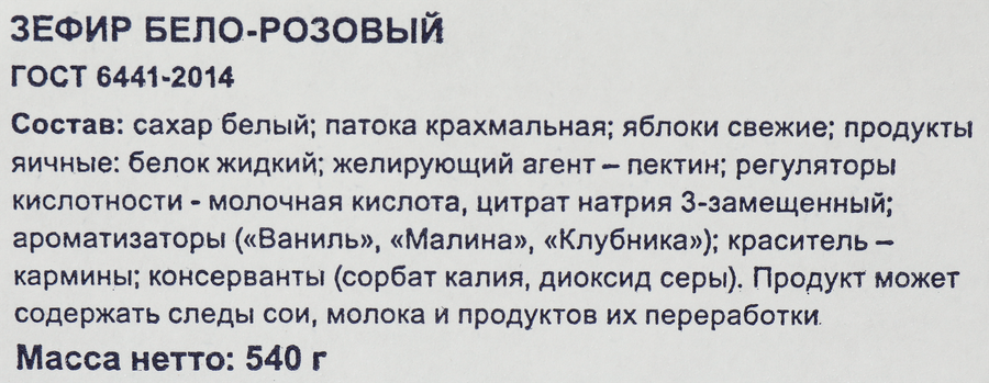 Сахар белый, патока крахмальная, яблоки свежие, продукты яичные: белок жидкий, желирующий агент – пектин, регуляторы кислотности –молочная кислота, цитрат натрия 3-замещенный, ароматизаторы (ваниль, малина, клубника), краситель – кармины, консерванты(сорбат калия, диоксид серы).