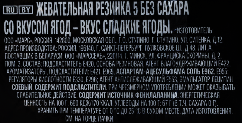 Подсластитель E420, основа резиновая, агент влагоудерживающий E422, ароматизаторы, краситель E170, подсластитель E421, эмульгатор –лецитин соевый, подсластители – аспартам-ацесульфама соль E962, E955, красители E172, E133. Содержит подсластители.