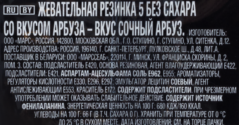 Жевательная резинка FIVE Сочный арбуз, без сахара позаботится о гигиене полости рта. Она вновь сделает ваше дыхание свежим и приятным и подарит комфорт, удалив остатки пищи. Воспользуйтесь жевательной резинкой, когда необходимо быстро и незаметно привести себя в порядок, ведь такую альтернативу зубной щетке можно всегда иметь под рукой. Кроме того, она не содержит сахара, но имеет сладкий ягодный вкус, который непременно поднимет вам настроение.