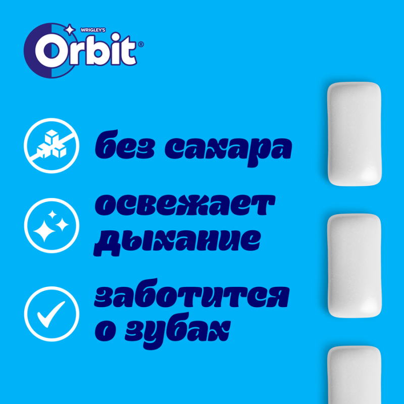 Жевательная резинка ORBIT Белоснежный Освежающая мята без сахара способствует поддержанию здоровья зубов: удаляет остатки пищи, способствует уменьшению зубного налета, нейтрализует вредные кислоты, усиливает процесс реминерализации эмали. Употребление жевательной резинки каждый раз после еды способствует поддержанию чистоты и здоровья зубов в дополнение к уходу за ротовой полостью с помощью зубной щетки.