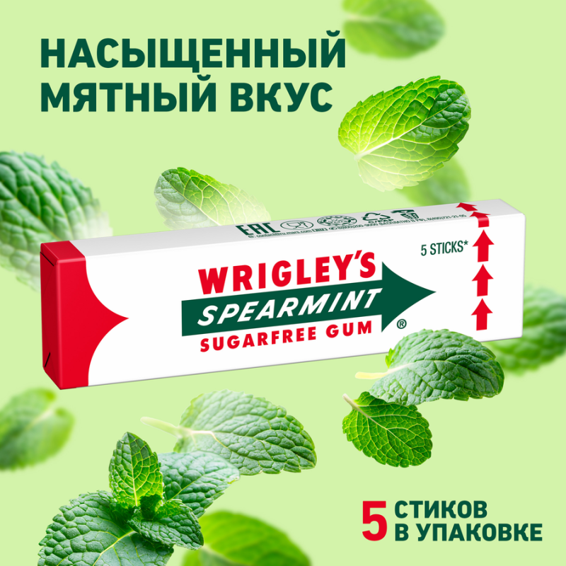 Жевательная резинка WRIGLEY’S Spearmint с классическим мятным вкусом. Без сахара.