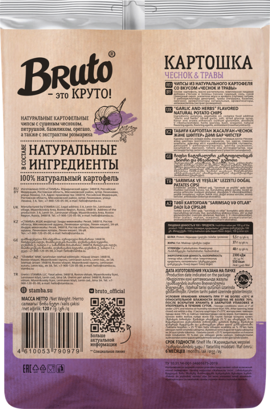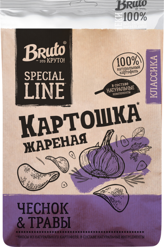 Чипсы картофельные BRUTO со вкусом чеснок и травы, из натурального картофеля составят удачное сочетание с прохладительными напитками, подойдут для быстрого перекуса. Они изготовлены из отборного картофеля, отличаются хрустящей текстурой и выразительным пикантным вкусом.