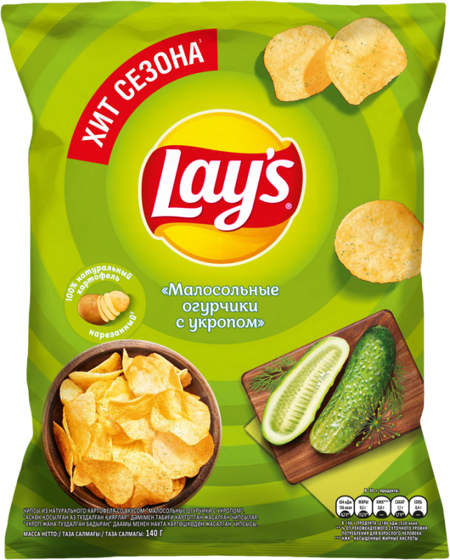Чипсы картофельные LAY’S Малосольные огурчики с укропом изготовлены из специально отобранного картофеля и соответствуют самым высоким стандартам качества. Хрустящие и легкие на вкус, они были созданы, чтобы вызвать улыбку на лице каждого человека, поэтому ими так приятно делиться с лучшими друзьями.