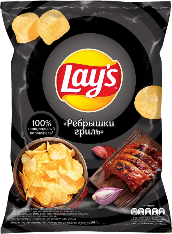 Чипсы картофельные LAY’S Ребра на гриле изготовлены из специально отобранного картофеля и соответствуют самым высоким стандартам качества. Хрустящие и легкие на вкус картофельные чипсы LAY’S были созданы, чтобы вызвать улыбку на лице каждого человека, поэтому ими так приятно делиться с лучшими друзьями. Чипсы LAY’S скрасят любой день. Яркий вкус ребрышек гриль в сочетании с хрустящими чипсами LAY’S из натурального и отобранного картофеля – настоящее удовольствие, которое можно разделить с друзьями и близкими.