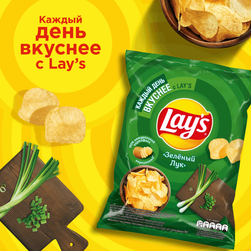 Чипсы картофельные LAY’S со вкусом молодого зеленого лука изготовлены из специально отобранного картофеля и соответствуют самым высоким стандартам качества. Они были созданы, чтобы вызвать улыбку на лице каждого человека, поэтому ими так приятно делиться с друзьями. Яркий вкус аппетитного зеленого лучка и хрустящие картофельные чипсы – это праздник, который всегда рядом. Из 100% натурального картофеля.