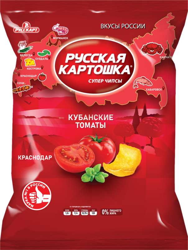 Чипсы картофельные РУССКАЯ КАРТОШКА со вкусом кубанских томатов составят удачное сочетание с прохладительными напитками, подойдут для быстрого перекуса. Они изготовлены из отборного картофеля, отличаются хрустящей текстурой и выразительным пикантным вкусом.