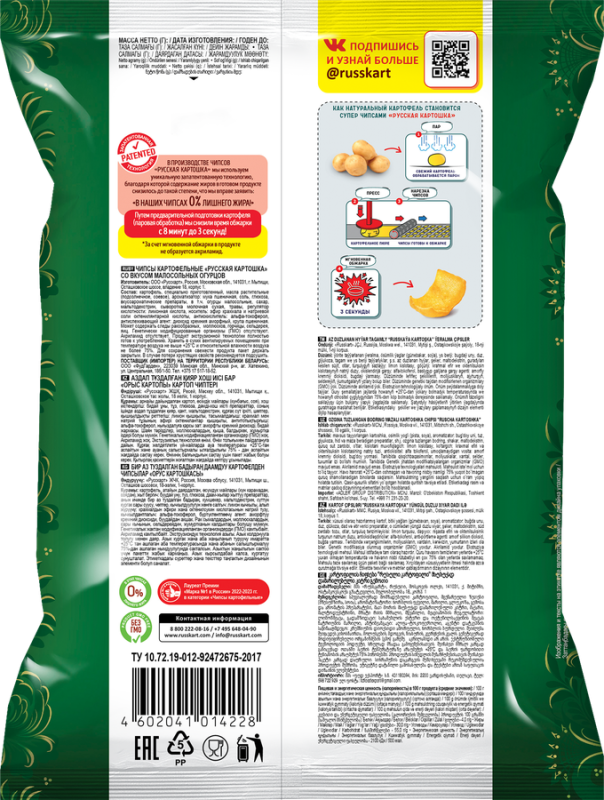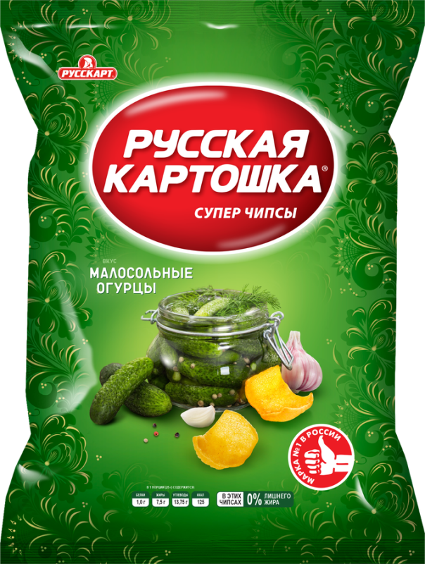 Чипсы картофельные РУССКАЯ КАРТОШКА со вкусом малосольных огурцов помогут скрасить досуг, составят удачное сочетание с прохладительными напитками, подойдут для быстрого перекуса. Они изготовлены из отборного картофеля, отличаются хрустящей текстурой и выразительным пикантным вкусом.