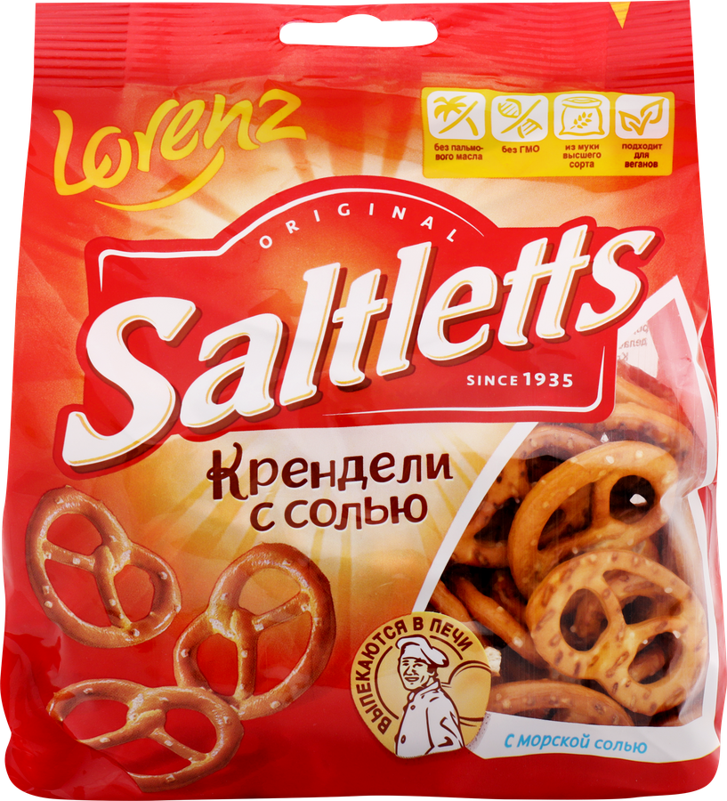 Крендель LORENZ Saltletts Классический с солью – это отличный вариант подкрепиться. Крендели Saltletts выпекаются в печи из высококачественных ингредиентов и приправлены морской солью. При производстве кренделей Saltletts используется мука высшего сорта и подсолнечное масло. Продукт не содержит ГМО и подходит для веганов. Большая удобная упаковка поможет разделить радость вкуса с друзьями и близкими. Saltletts – настоящие, хрустящие, приносящие радость! Saltletts ‒ печем на радость!