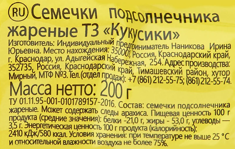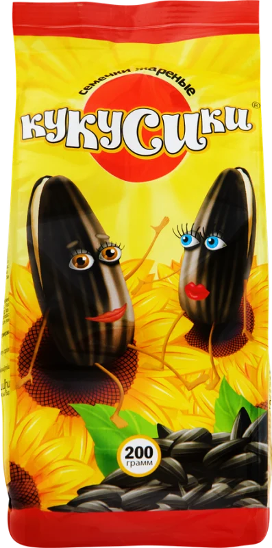 Семечки подсолнечника КУКУСИКИ жареные в большой пачке содержат отборные семена подсолнечника средней обжарки с насыщенным вкусом и ароматом.
