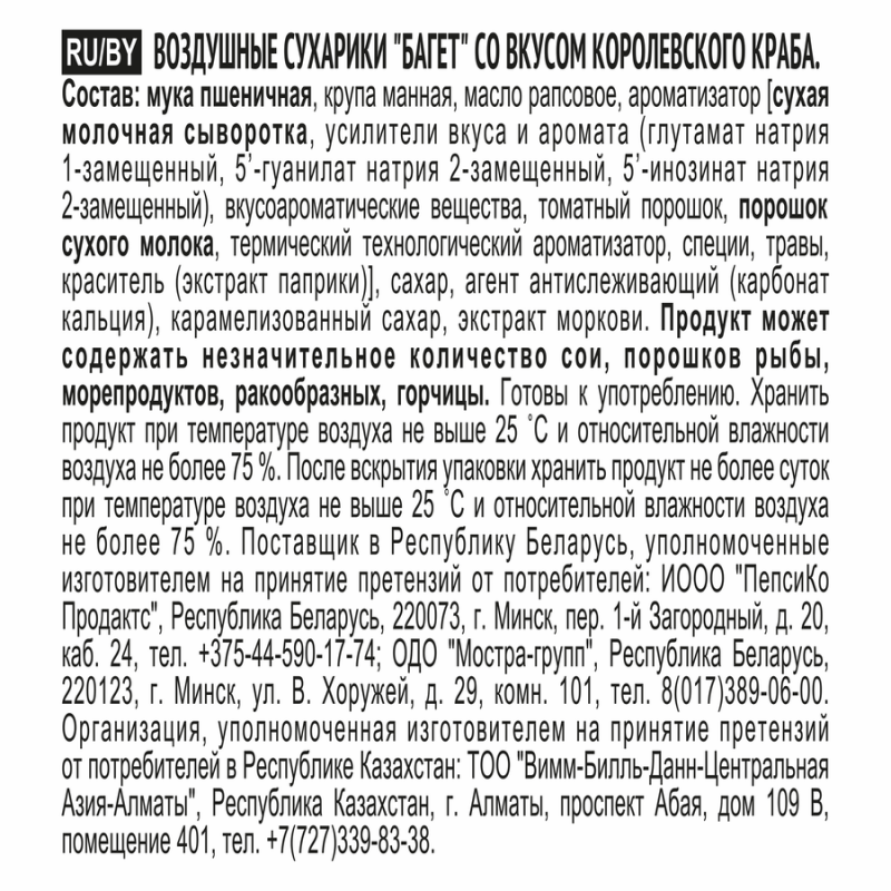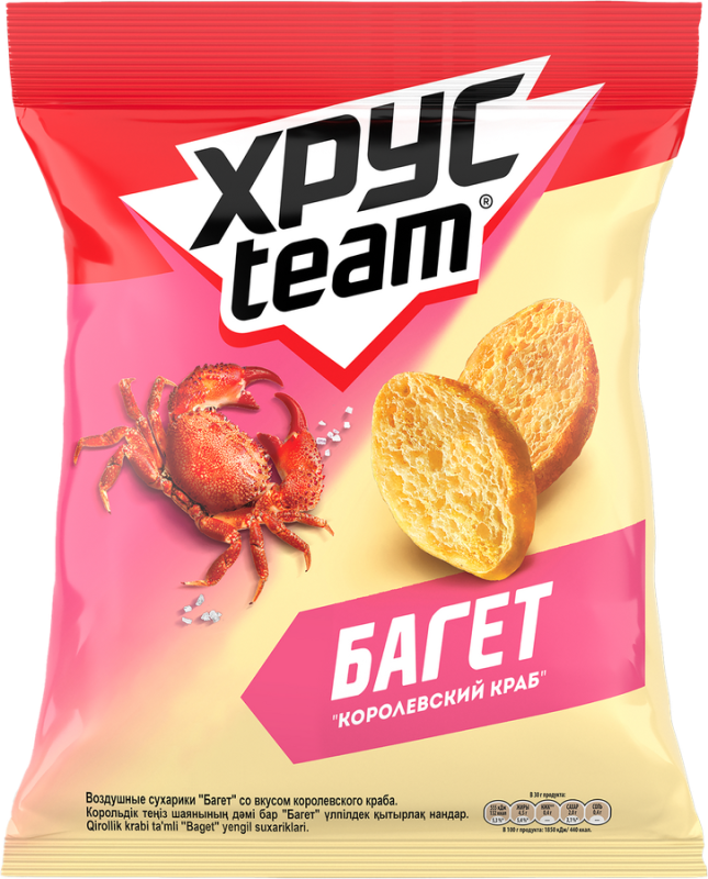 Сухарики ХРУСTEAM Багет Королевский краб – воздушные и хрустящие, тают во рту. Их деликатный вкус оставляют приятное послевкусие. На создание этих сухариков компанию вдохновил восхитительный французский багет в сочетании с изысканными вкусами. Когда хочешь сделать перерыв, открывай ХРУСTEAM.