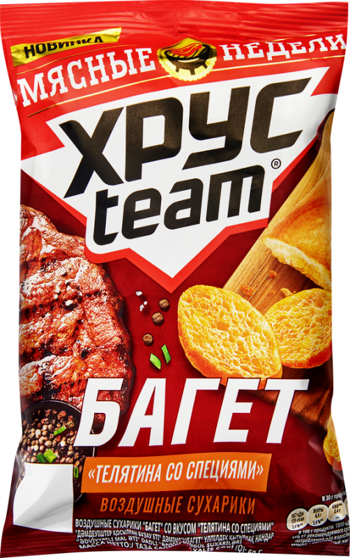 Сухарики пшеничные ХРУСTEAM со вкусом телятины со специями отличаются хрустящей текстурой и выразительными дегустационными качествами. Они изготовлены из пшеничного хлеба с добавлением молотых пряностей, растительного масла и других компонентов. Аппетитный снек быстро утоляет голод, заряжает энергией и гармонично сочетается с различными напитками.