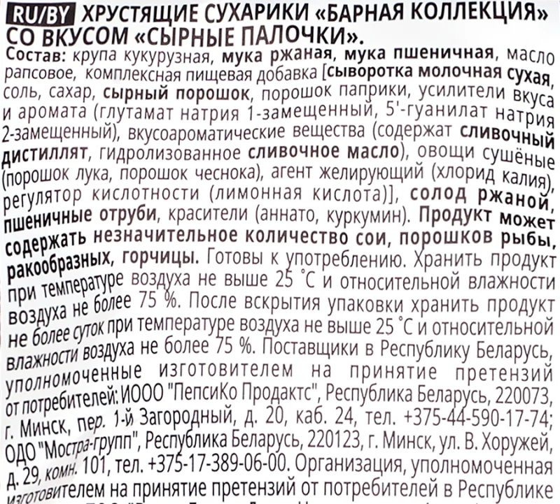 Крупа кукурузная, мука ржаная, мука пшеничная, масло рапсовое, комплексная пищевая добавка (сыворотка молочная сухая, соль, сахар,сырный порошок, порошок паприки, усилители вкуса и аромата (глутамат натрия 1-замещенный, 5-гуанилат натрия 2-замещенный),вкусоароматические вещества (содержат сливочный дистиллят, гидролизованное сливочное масло), овощи сушеные (порошок лука, порошокчеснока), агент желирующий – хлорид калия, регулятор кислотности – лимонная кислота), солод ржаной, пшеничные отруби, красители(аннато, куркумин).