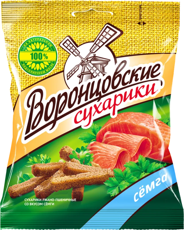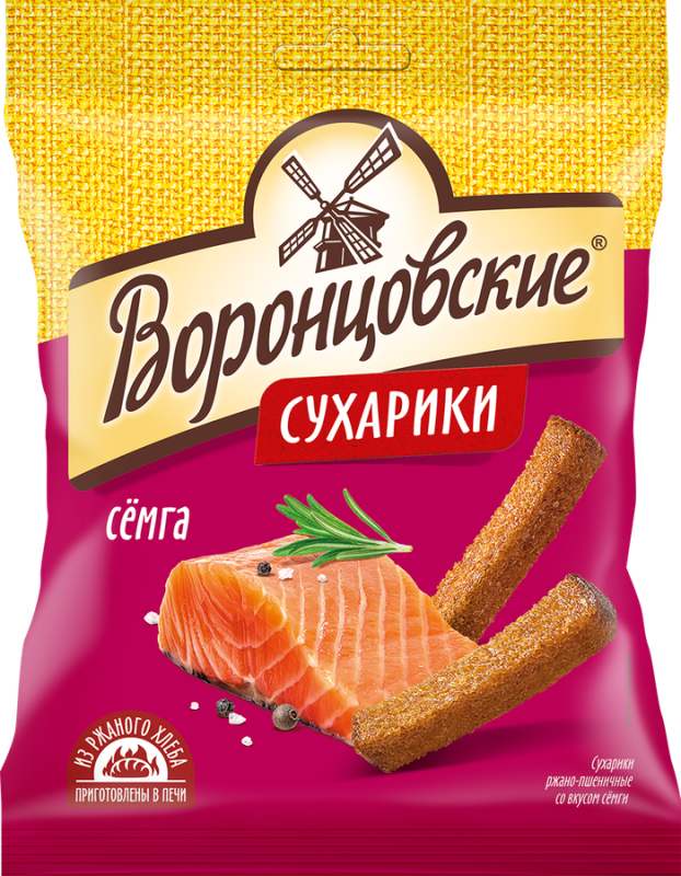 Сухарики ржано-пшеничные ВОРОНЦОВСКИЕ со вкусом семги отличаются хрустящей текстурой и выразительными дегустационными качествами. Аппетитный снек быстро утоляет голод, восстанавливает силы и заряжает энергией. Такие сухарики можно употреблять в качестве вкусного и сытного перекуса, подавать как сопровождение к прохладительным напиткам, добавлять в различные салаты.
