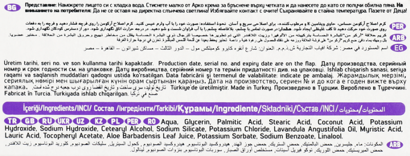 Вода, Глицерин, Пальмитиновая кислота, стеариновая кислота, Кокосовая кислота, Гидроксид калия, гидроксид натрия, Цетеариловый спирт, Борат натрия, Силикат натрия, хлорид калия, Масло лаванды узколистной, токоферилацетат, Сок листьев Алоэ Барбадосского, сорбат калия, Бензоат натрия, Линалоол.