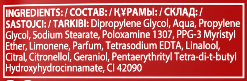 Dipropylene Glycol, Water, Propylene Glycol, Sodium Stearate, Fragrance, PPG-3 Myristyl Ether, Triclosan, Tetrasodium Edta, SodiumHydroxide, D&C Violet 2, D&C Green 6.