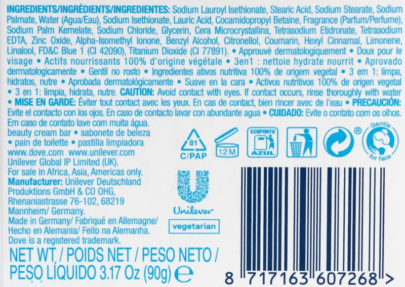 Sodium Lauroyl Isethionate, Stearic Acid, Lauric Acid, Sodium Palmate, Water (Aqua/Eau), Sodium Isethionate, Sodium Stearate,Cocamidopropyl Betaine, Sodium Palm Kernelate, Glycerin, Fragrance (Parfum/Perfume), Sodium Chloride, Cera Microcristallina, ZincOxide, Tetrasodium EDTA, Tetrasodium Etidronate, Alpha-Isomethyl Ionone, Benzyl Alcohol, Citronellol, Coumarin, Hexyl Cinnamal,Limonene, Linalool, CI 42090, CI 77891.
