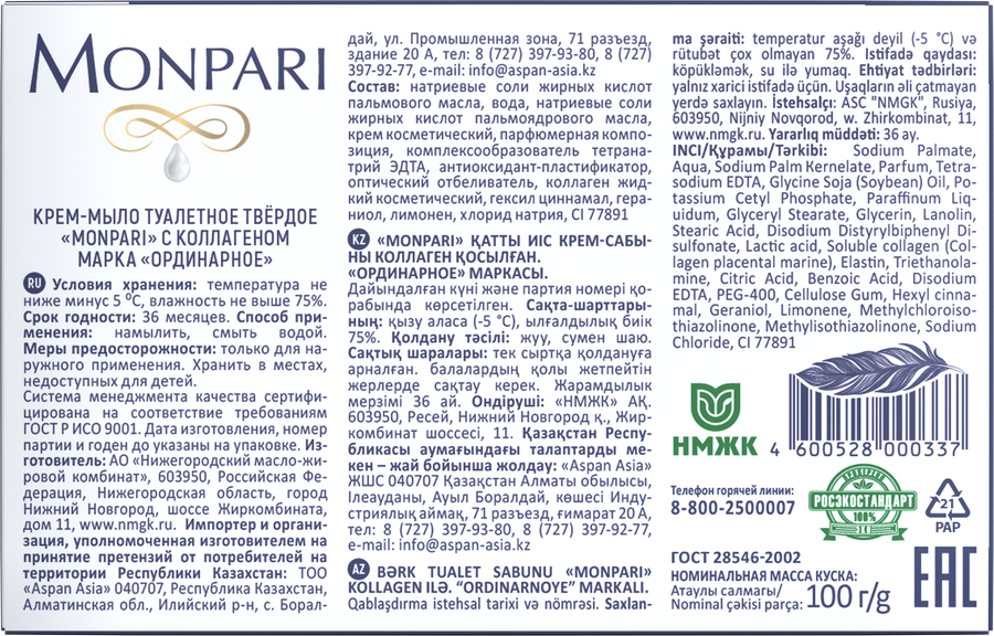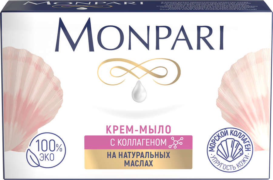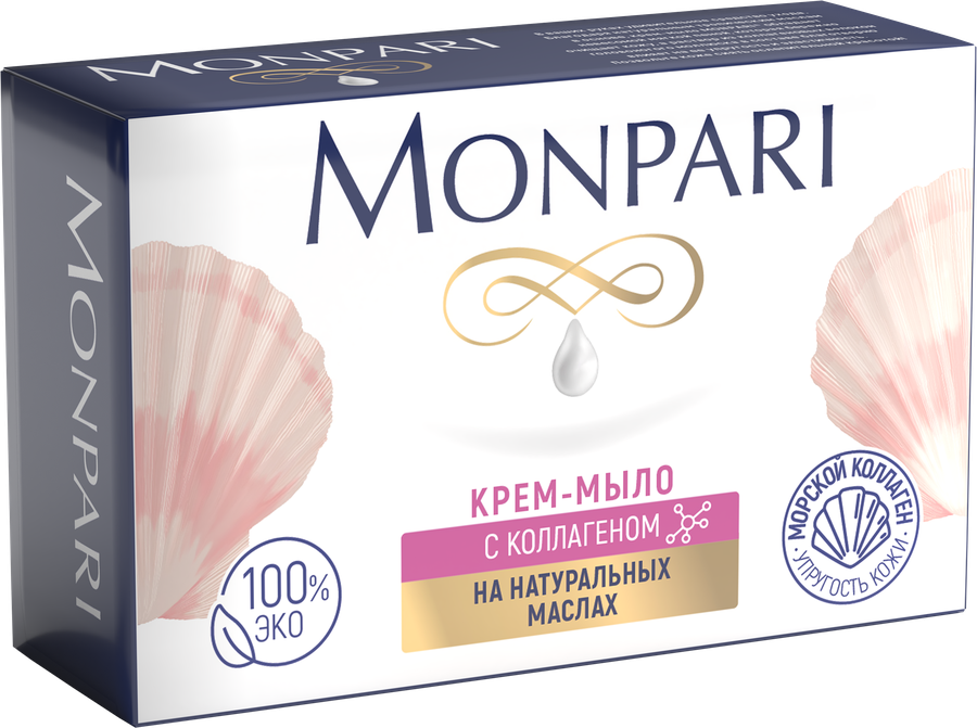 Мыло туалетное MONPARI с коллагеном из натуральных тропических масел для бережного очищения. В состав входит инновационный биоактивный ингредиент – комплекс морского коллагена, который способствует увлажнению, повышению упругости и эластичности кожи.