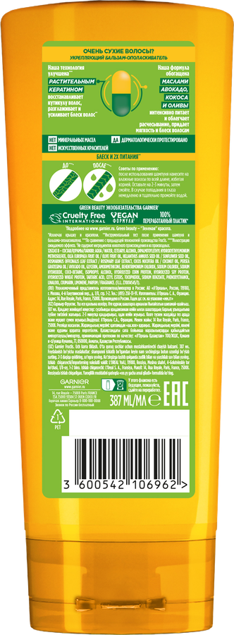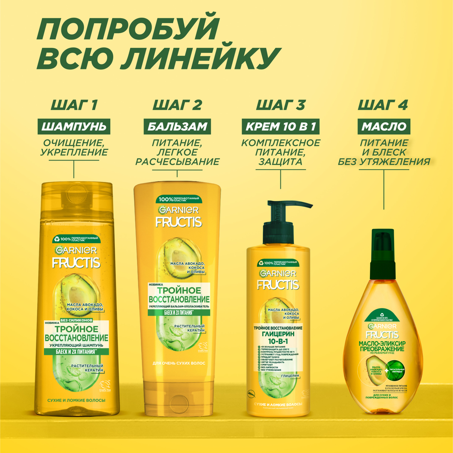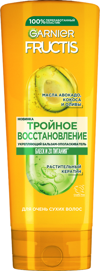 Укрепляющий бальзам для поврежденных и ослабленных волос FRUCTIS «Тройное восстановление» глубоко восстанавливает и укрепляет волосы от корней до кончиков. Ваши волосы снова крепкие, блестящие, выглядят здоровыми. Три масла проникают в каждый слой волоса, восстанавливают, укрепляют его изнутри и возвращают здоровый блеск, обеспечивая легкое расчесывание. Олива – против ломкости, укрепляет сердце волоса. Авокадо – против сухости, восстанавливает и питает средний слой волоса. Карите – против тусклости, восстанавливает и разглаживает поверхность волоса.