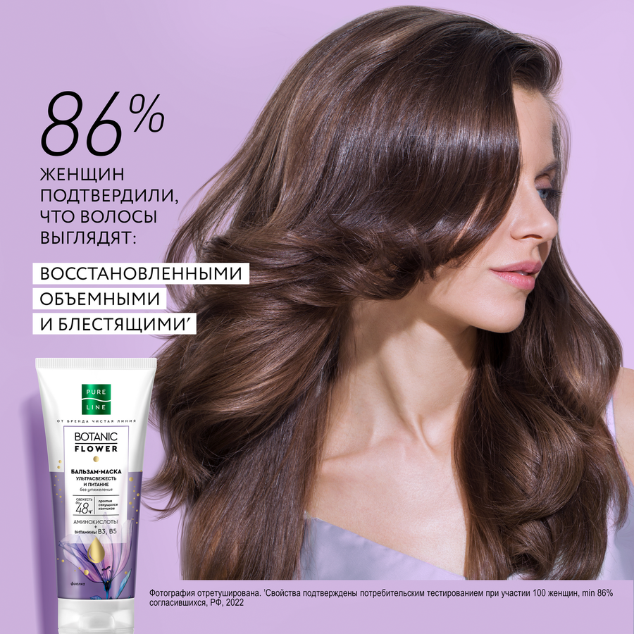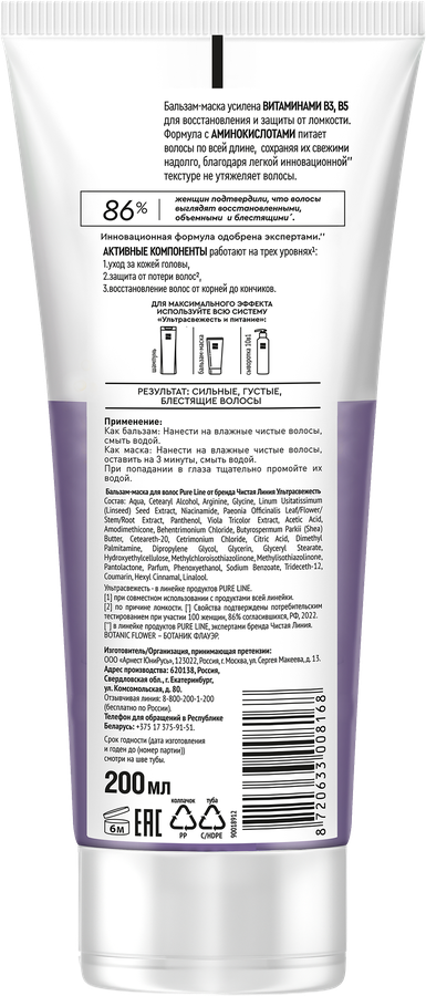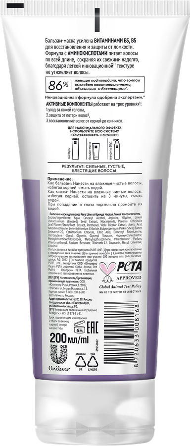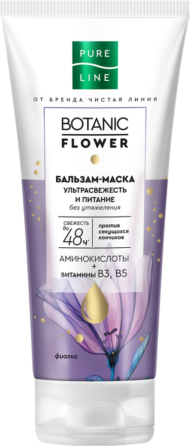 Формула бальзам-маски для волос ЧИСТАЯ ЛИНИЯ Ульрасвежесть и питание усилена витаминами В3, B5 для восстановления и защиты от ломкости. Аминокислоты питают волосы по всей длине, сохраняя их свежими надолго. Легкая инновационная текстура не утяжеляет волосы. Продукт может быть использован как бальзам и как маска. Активные компоненты работают на трех уровнях: уход за кожей головы; защита от потери волос; восстановление волос от корней до кончиков. Не утяжеляет волосы и подходит для ежедневного применения.