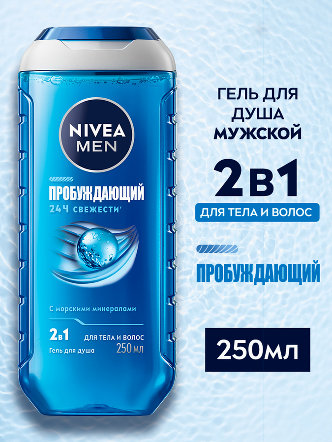 Гель для душа мужской NIVEA Пробуждающий прибавит сил и бодрости на весь день. Формула средства с морскими минералами обеспечивает мягкое очищение, смягчение, защиту и активизирует процессы обновления кожи и волос. Гель с оптимальным для кожи головы уровнем pH не вызывает ощущения сухости. Он пробуждает и тонизирует, обладает свежим мужским ароматом. Начни день правильно – проснись и зарядись энергией свежести и бодрости на весь день! Средство подходит для ежедневного применения.