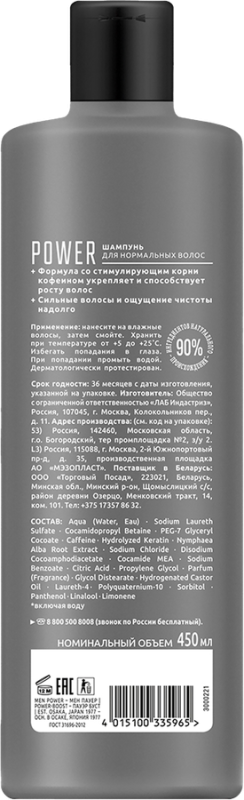 Aqua (Вода, туалетная вода), Лауретсульфат натрия, Кокамидопропилбетаин, ПЭГ-7 Глицерилкокоат, хлорид натрия, Кофеин, гидролизованный кератин, Экстракт корня Нимфеи Белой, Динатриевый кокоамфодиацетат, Кокамид МЕА, бензоат натрия, Лимонная кислота, Пропиленгликоль, Парфюмерия (отдушка), Дистеарат гликоля, гидрогенизированное касторовое масло, Лаурет-4, Пантенол, поликватерниум-10, Линалоол, Лимонен, сорбит.