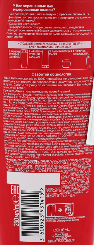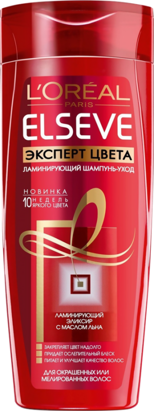 Шампунь для окрашенных или мелированных волос ELSEVE «Эксперт Цвета» содержит ламинирующий эликсир с маслом льна, обеспечивающий значительный результат сразу в трех направлениях: 1) надолго сохраняет яркость и насыщенность цвета, препятствуя вымыванию красящих пигментов; 2) дарит волосам роскошное сияние; 3) глубоко питает волосы и кожу головы, делая волосы гладкими и шелковистыми до самых кончиков. Благодаря эффекту профессионального ламинирования ваши волосы сохраняют яркость и блеск до 10 недель!