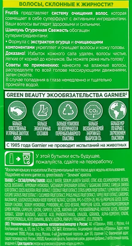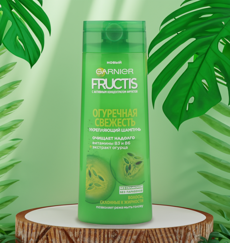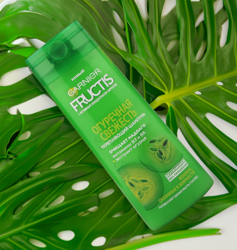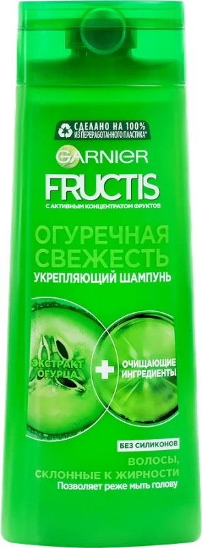 Уникальная формула шампуня для волос FRUCTIS Свежесть без силиконов и парабенов, обогащенная экстрактом огурца и витаминами B3 и B6, укрепляет и очищает кожу головы, обеспечивая эффективный и бережный уход. Избыток кожного жира удаляется, волосы становятся чистыми, легкими от самых корней.