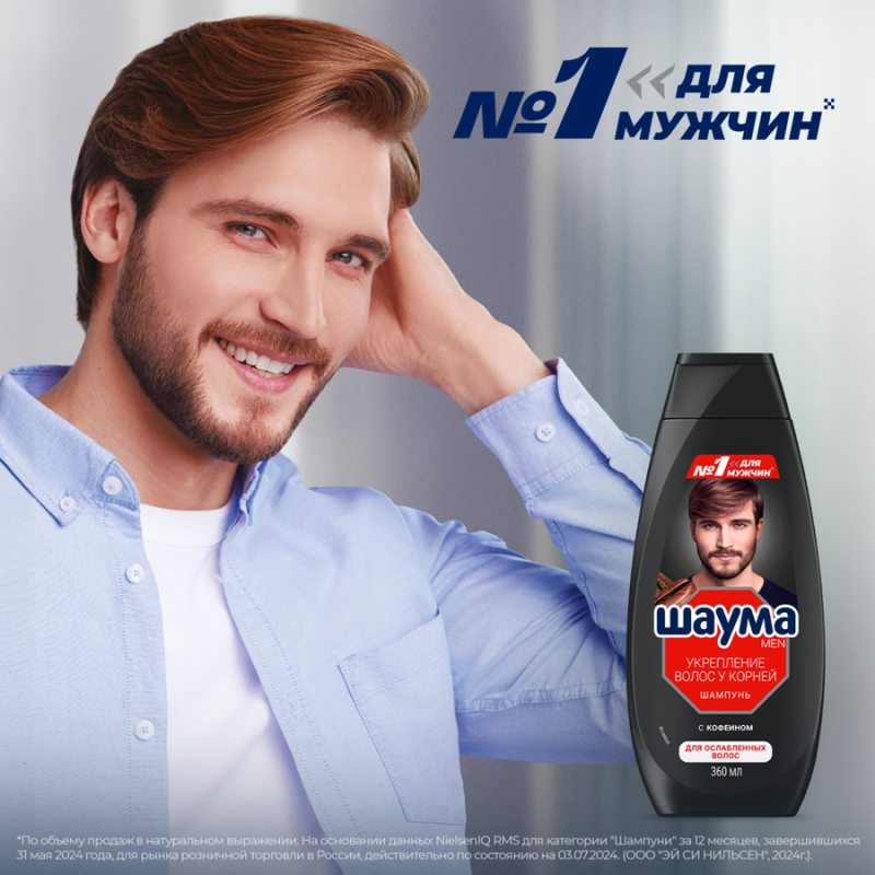 Шампунь для волос мужской ШАУМА Men Укрепление волос у корней для ежедневного применения укрепляет волосы, придает волосам силу, а также тщательно очищает и удаляет загрязнения с кожи головы. Шампунь с кофеином. Подходит для ослабленных волос. Содержит больше 90% ингредиентов натурального происхождения включая воду. Без силиконов. Не содержит ингредиентов животного происхождения.