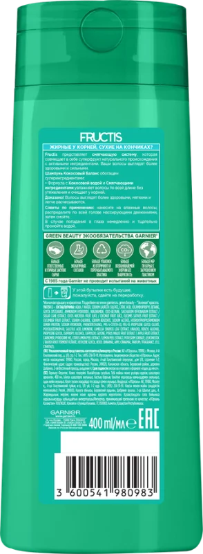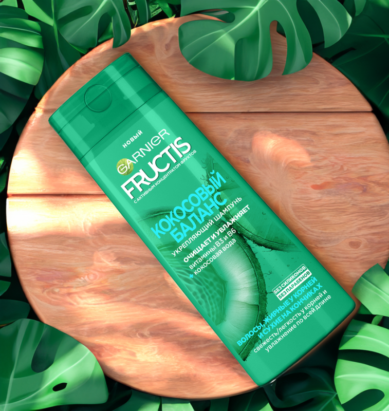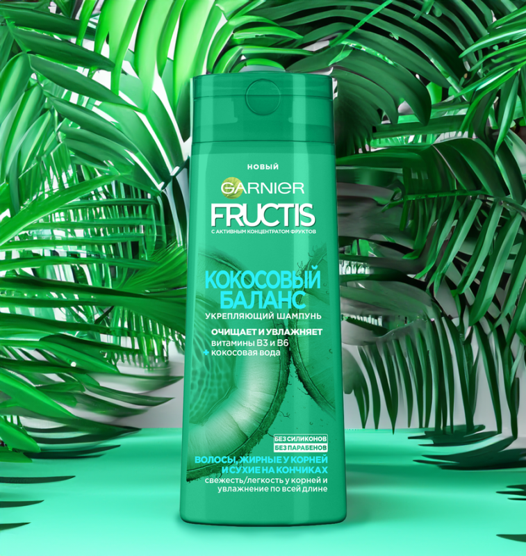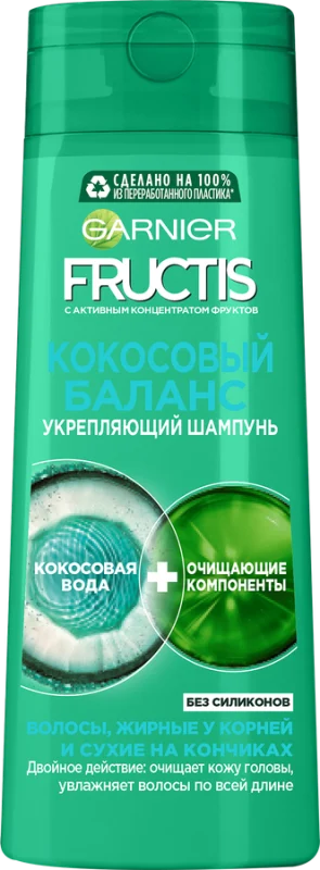 Шампунь для волос жирных у корней и сухих на кончиках FRUCTIS «Кокосовый баланс» обогащен кокосовой водой и витаминами В3 и В6, очищает у корней и увлажняет до самых кончиков. Результат: свежие у корней и увлаженные волосы по всей длине. Новая формула FRUCTIS не содержит парабенов и силиконов, обогащена активным концентратом фруктов. Благодаря комбинации фруктов, витаминов В3, В6 и протеина лимона ваши волосы более сильные и блестящие.
