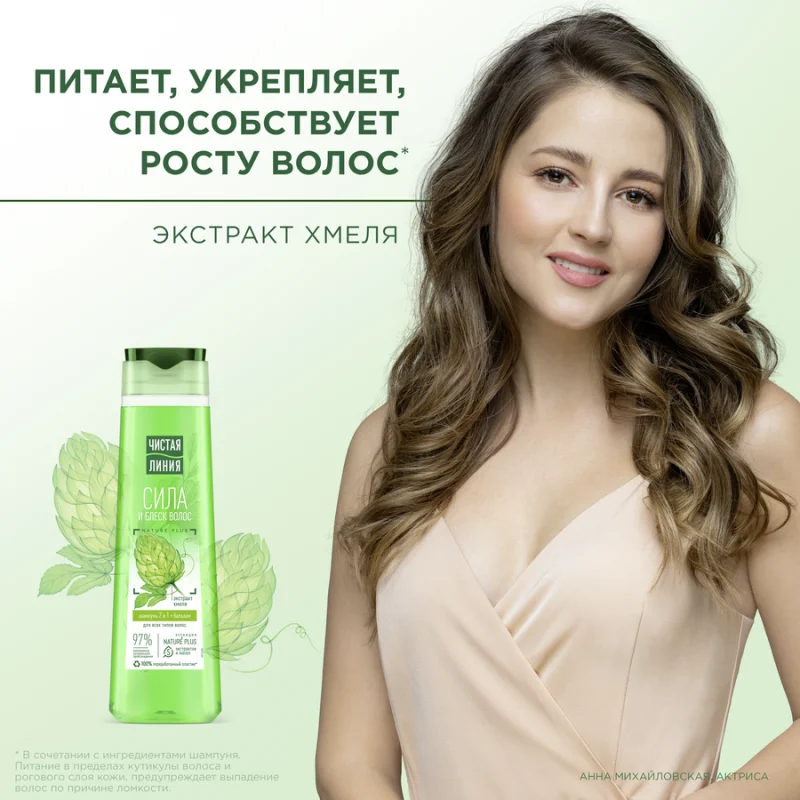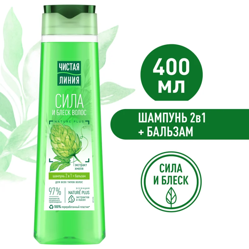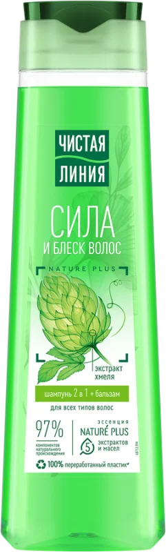 Шампунь для всех типов волос ЧИСТАЯ ЛИНИЯ 2в1 «Хмель» на отваре целебных трав предназначен для комплексного ухода для всех типов волос. Активные натуральные компоненты средства активизируют рост волос, питая волосяные луковицы, а также обеспечивают комплексный уход благодаря увлажнению и смягчению волосы защищены от повреждений. Экстракт хмеля широко используется в косметических средствах для ухода за волосами, он эффективно помогает заботиться о красоте волос, укрепляет по всей длине, ухаживает за кожей головы. Шишки хмеля содержат лупулин (сложная смесь различных веществ), эфирное масло, биостимуляторы, гликозиды, витамины группы В и РР. Лупулин оказывает успокаивающее действие. Флавоноиды (биологически активные вещества, обладающие антиоксидантными свойствами) и витамины в экстракте шишек хмеля обеспечивают противовоспалительный и капилляроукрепляющий эффект. Доказано: при использовании шампуня совместно с бальзамом эффективность возрастает в 3 раза!