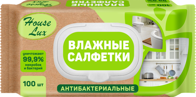 Салфетки влажные антибактериальные №100 от торговой марки HOUSE LUX изготовлены по технологии «уборка одним движением». Они очищают любые моющие поверхности в туалете, ванной или кухне. Уникальная пропитка уничтожает до 99,9 % микробов, эффективно растворяют загрязнения и дезинфицируют поверхность. Антибактериальный эффект обеспечивает изопропанол. Изделия абсолютно безопасны для кожи рук. В упаковке 100 влажных салфеток.
