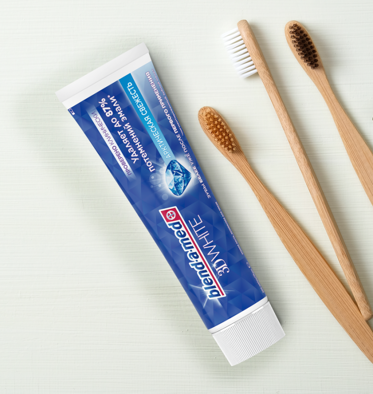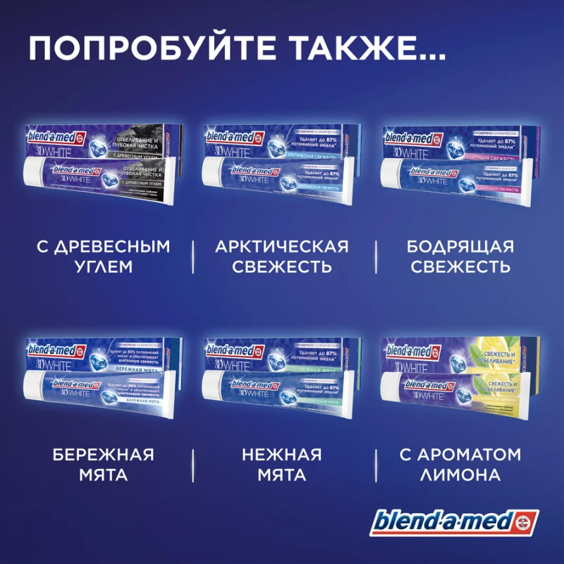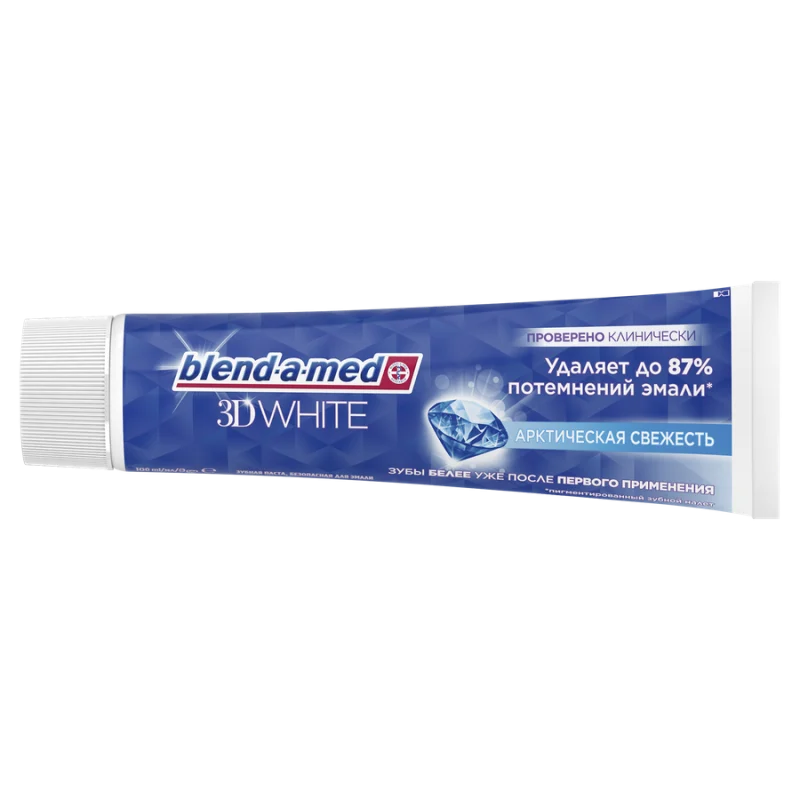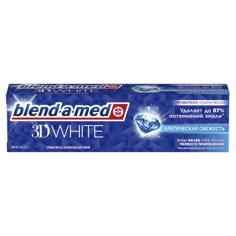 Зубная паста BLEND-A-MED 3D White «Арктическая свежесть» удаляет до 87% пигментированного зубного налета и делает зубы белее уже после первого применения. Проверено клинически. Отбеливает, удаляя до 87% пигментированного зубного налета. Зубы белее уже после первого применения. Безопасна для эмали.