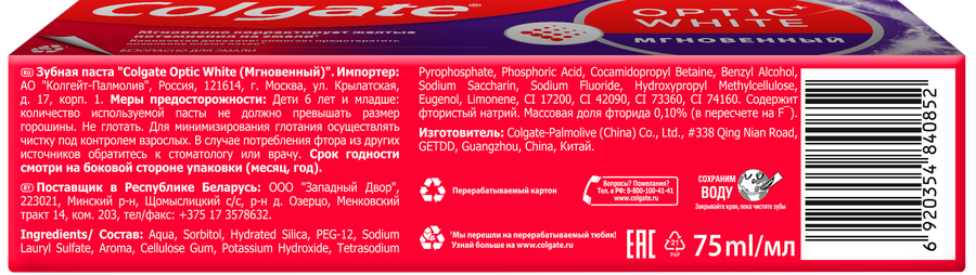 Зубная паста COLGATE Optic White Мгновенный, 75мл