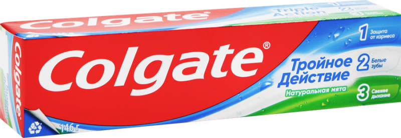 Зубная паста COLGATE Тройное Действие обеспечивает максимальную защиту от кариеса. Эта трехцветная зубная паста оказывает тройное действие: помогает защищать зубы от кариеса, помогает удалять потемнения с поверхности зубов и освежает дыхание. Что немаловажно, COLGATE Тройное Действие обладает приятным мятным вкусом! Произведено с заботой, чтобы Вы могли чаще улыбаться. Рекомендовано: для ежедневного ухода, для устранения налета, для борьбы с неприятным запахом изо рта, для защиты от кариеса, для отбеливания зубов. Текстура зубной пасты: паста.