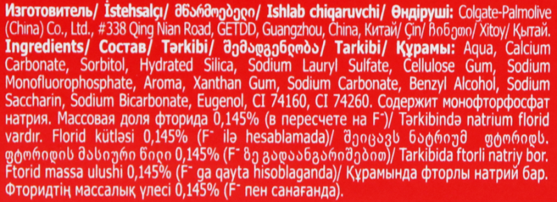 Calcium Carbonate, Aqua, Sorbitol, Sodium Lauryl Sulfate, Hydrated Silica, Sodium Monofluorophosphate, Aroma, Cellulose Gum,Magnesium Aluminum Silicate, Sodium Carbonate, Benzyl Alcohol, Sodium Saccharin, Sodium Bicarbonate, Limonene, Eugenol, Cl 74260, Cl74160.