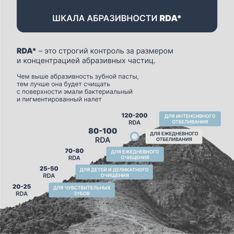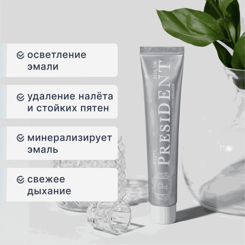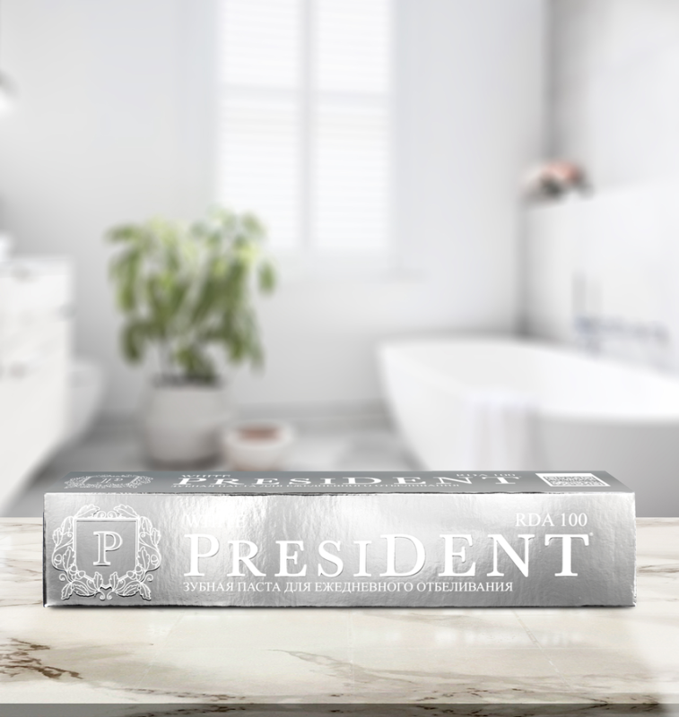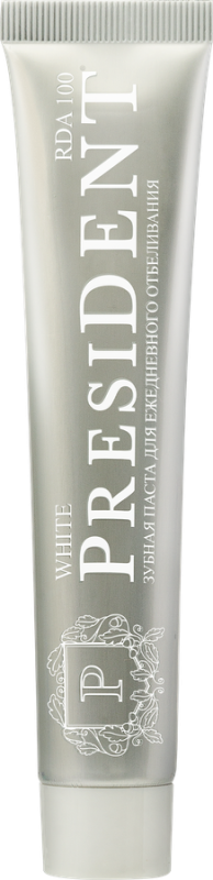 Зубная паста PRESIDENT White RDA 100* подходит для ежедневного отбеливания. Исландский мох расщепляет белковый налет. Кальций-кремниевая композиция эффективно очищает и бережно отбеливает эмаль. Мята освежает дыхание. Фтор укрепляет эмаль и защищает от кариеса. *RDA – это строгий контроль размера и концентрации абразивных частиц. Специально подобранные абразивы безопасно и эффективно удаляют налет, очищают и полируют зубную эмаль. Чем выше абразивность зубной пасты, тем лучше она будет счищать с поверхности эмали бактериальный и пигментированный налет. Применение: ежедневно, после каждого приема пищи, не менее двух раз в день.
