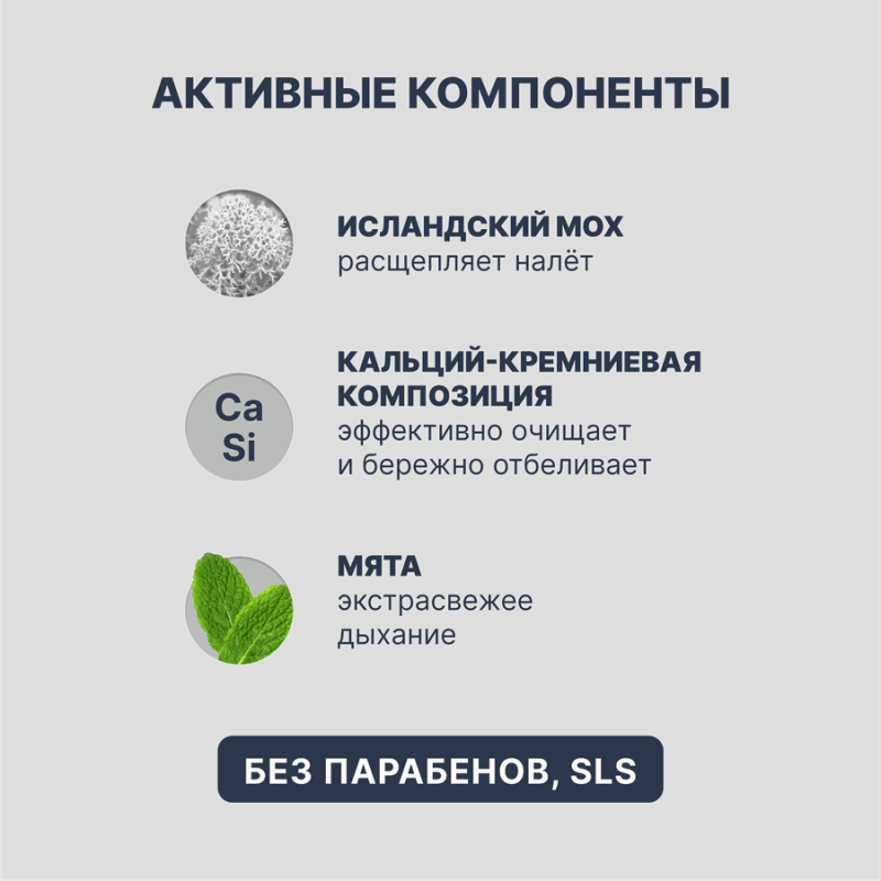 Dicalcium Phosphate Dihydrate, Sorbitol, Aqua, Glycerin, Hydrated Silica, Sodium Lauryl Sulfate, Cellulose Gum, Aroma, SodiumMonofluorophosphate, Panax Ginseng Root Extract, Cetraria Islandica Extract, Mentha Piperita Extract, Sodium Methylparaben, SodiumSaccharin, CI 74160, Limonene. Содержит монофторфосфат натрия.Массовая доля фторида F=1350 ppm.